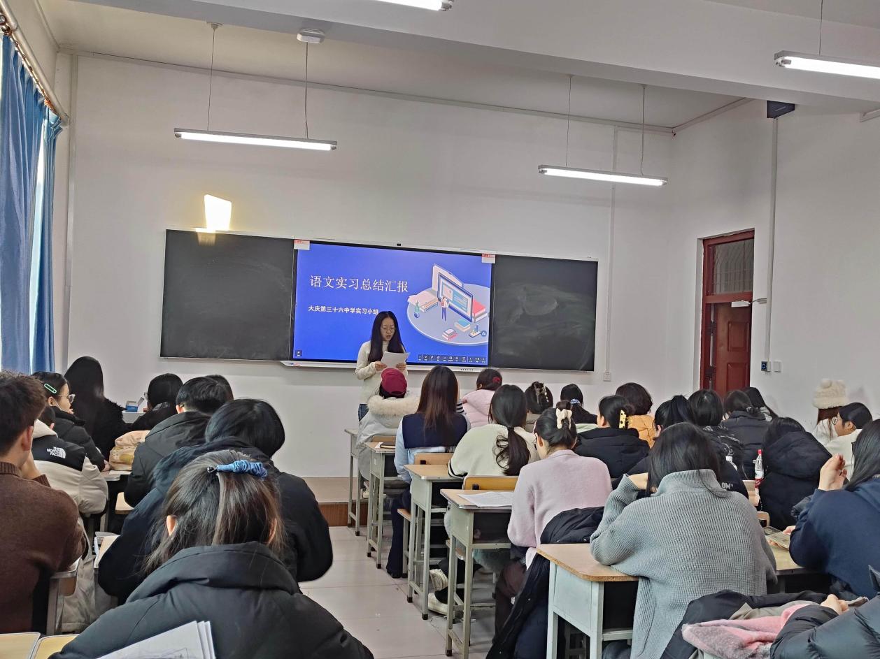 本次实习自 2025 年 9 月 1 日启动,历时 14 周,94 名实习生分赴大庆市第三十六中学、大庆三中、景园中学、嘉城学校等实习单位,圆满完成了教学实习、班主任工作实习等各项任务。实习期间,同学们严格遵循语文课程标准,在指导教师的悉心指导下,从观摩学习到独立备课、试讲授课,从班级日常管理到主题班会组织,全方位参与教育教学实践,不仅将专业理论知识转化为实际教学能力,更树立了热爱教育事业的责任感与事业心。