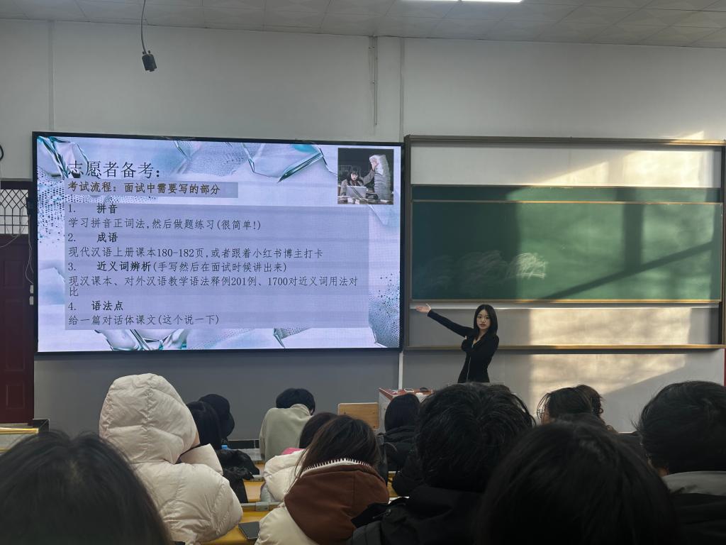 分享会上,马仲旺结合备考经历,从笔试规划、知识点梳理、资料筛选等方面分享经验。他强调笔试涵盖汉语基础、对外汉语教学理论等多领域,需构建系统知识框架,建议制定详细复习计划、合理分配时间,积累时政热点与中外文化对比知识,并现场讲解了难点题型的解题技巧与典型例题。