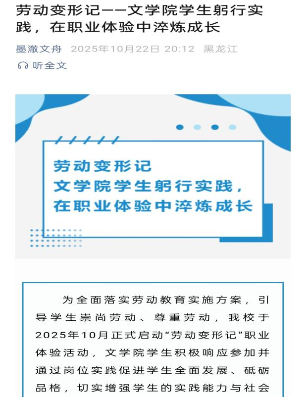 为深入贯彻落实国家劳动教育相关文件精神,充分发挥劳动教育综合育人功效,文学院于2025年9月—12月,围绕“劳动‘趣’实践 青春‘创’未来”主题,统筹谋划、精准推进系列劳动教育活动,联动校内公寓管理中心、后勤管理处等部门,推动活动扎实落地,助力学生在劳动实践中锤炼品格、提升能力,现将活动开展情况总结如下。