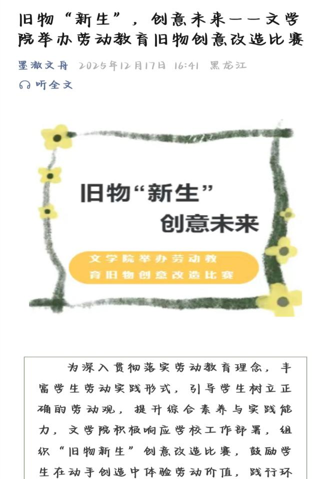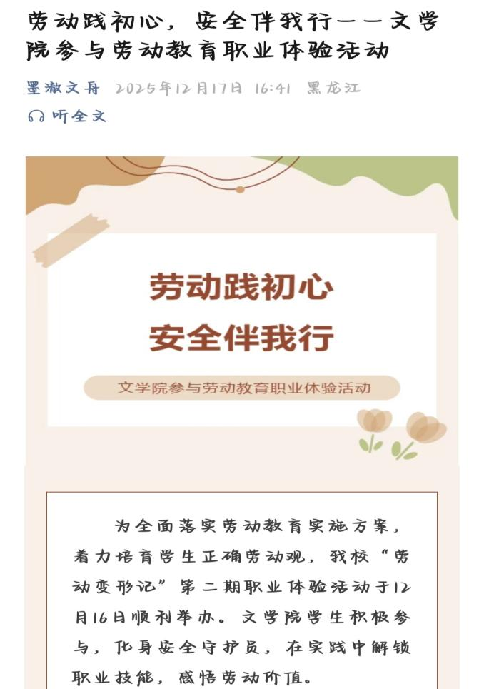 为深入贯彻落实国家劳动教育相关文件精神,充分发挥劳动教育综合育人功效,文学院于2025年9月—12月,围绕“劳动‘趣’实践青春‘创’未来”主题,统筹谋划、精准推进系列劳动教育活动,联动校内公寓管理中心、后勤管理处等部门,推动活动扎实落地,助力学生在劳动实践中锤炼品格、提升能力,现将活动开展情况总结如下。