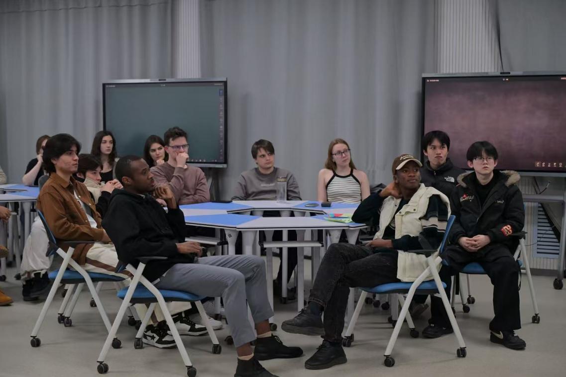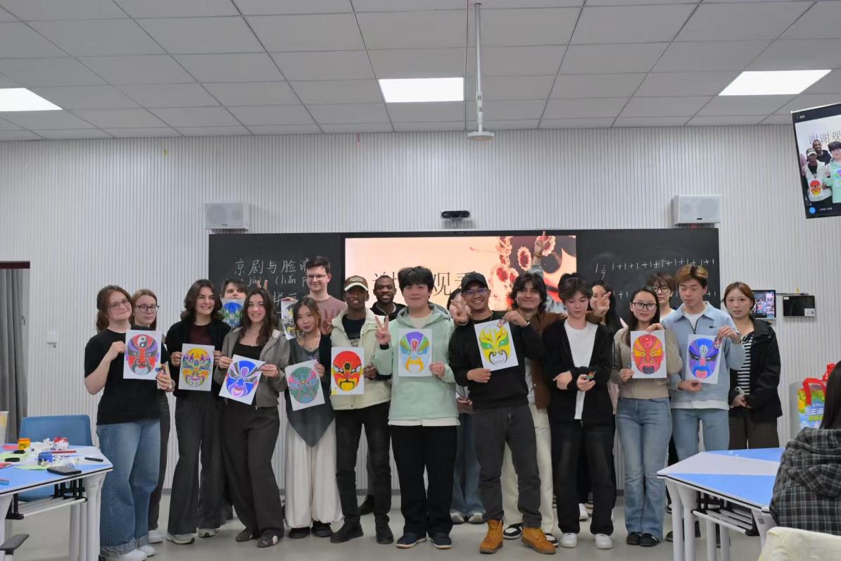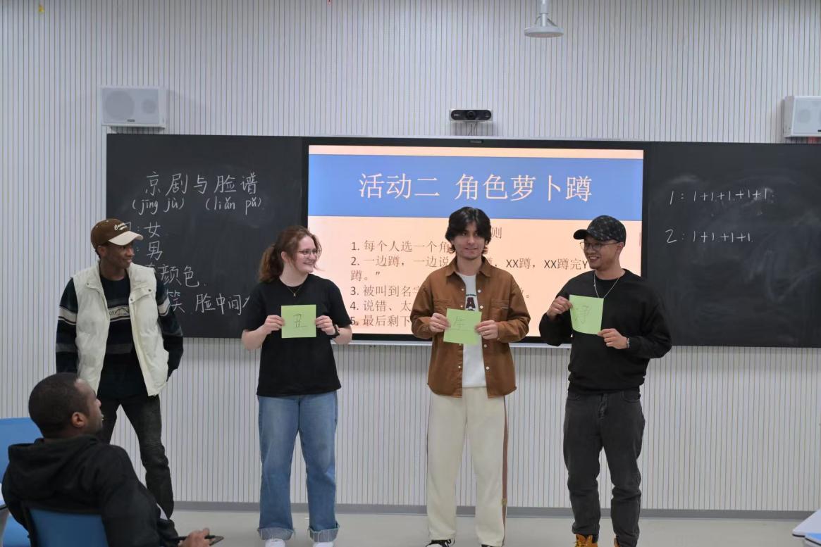 作为学生党员,陈子健立足专业特色,以京剧脸谱为载体,向留学生介绍京剧的文化价值以及脸谱的起源与艺术特点,帮助留学生建立初步认知。在讲解过程中,他深入浅出地解析脸谱色彩、图案背后的文化意涵,将抽象的符号转化为易于理解的故事,并借助脸谱实物,引导留学生近距离感受传统工艺的魅力。为增强参与感,他还设计了“脸谱猜猜猜”“角色萝卜蹲”等互动游戏,让留学生在抢答和动手绘制脸谱的过程中深入理解中国文化,现场气氛热烈,洋溢着跨文化交流的温暖。