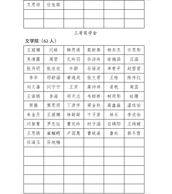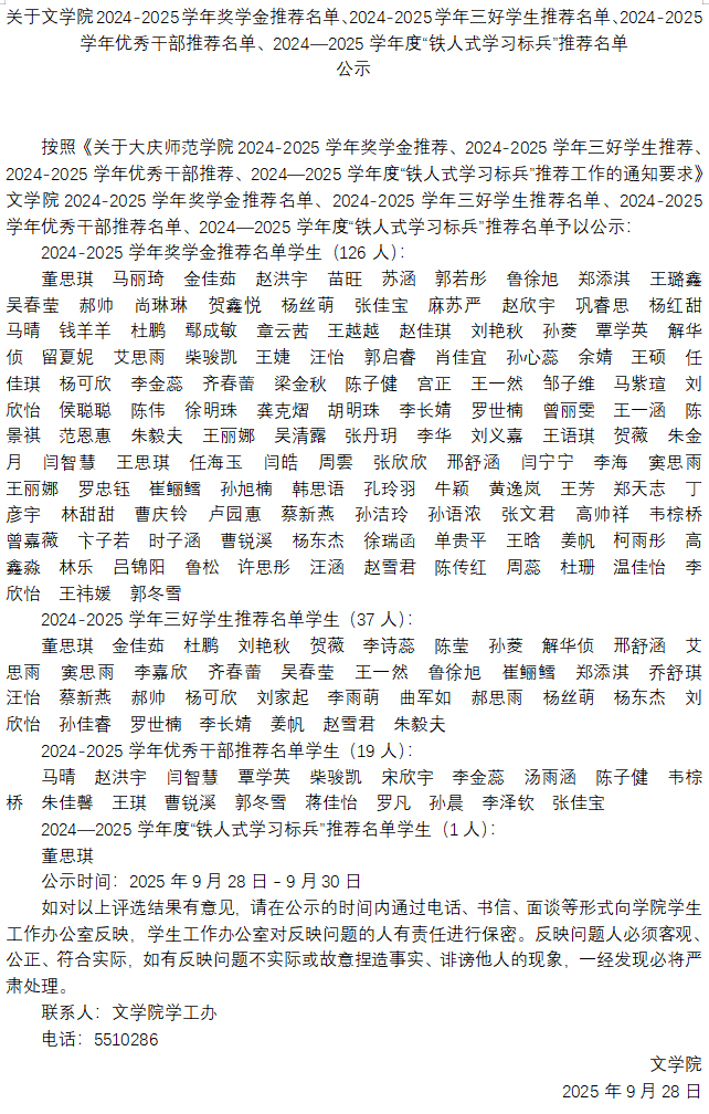 关于文学院2024-2025学年奖学金推荐名单、2024-2025学年三好学生推荐名单、2024-2025学年优秀干部推荐名单、2024—2025学年度“铁人式学习标兵”推荐名单公示